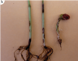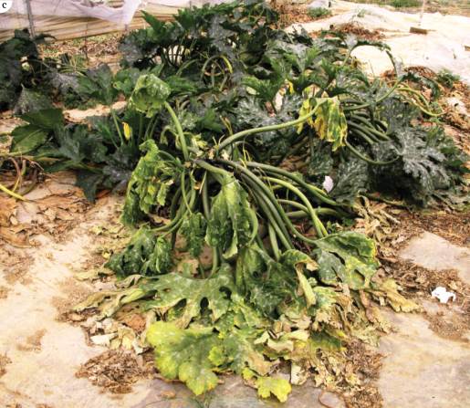 Fig. 4.14: (a) Onion plants with symptoms of fusarium wilt by Fusarium oxysporum f. sp. cepae, on the left, compared with a healthy plant on the right; (b) Symptoms of Rhizoctonia solani infection on bean plants; (c) Corgette plants with symptoms caused by Fusarium solani f. sp. cepae race 1. (RR)