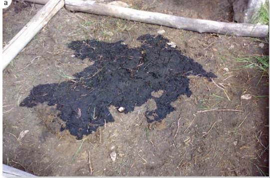 (a) shows the oil spill on day 1. Due to the porous nature of soil it would not be possible to remove the oil spill without removing a large amount of soil which would then have to be treated as contaminated waste. Due to the toxic nature of crude oil it is very unlikely that any plants could grow here with the soil in this condition.