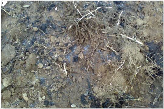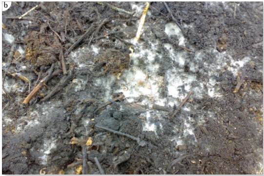 (b) shows the oil spill on day 14 after inoculation with the combined strains of Trametes versicolor and Pleurotus ostreatus. The fungal hyphae are so abundant growing on the oil spill that they are clearly visible as the white on the soil. Already, after just 2 weeks the oil is greatly reduced.