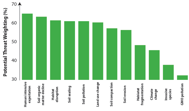 To quantify these threats, an expert evaluation was conducted. A soil biodiversity expert working group convened at the European Commission's Joint Research Centre (JRC). Using a structured questionnaire, twenty experts assigned a severity weighting (1-10) to each identified threat. Individual scores were summed and calculated as a percentage of the maximum possible score (200) to mitigate subjective bias from individual backgrounds. The results are presented in Figure 5.2. This survey addressed a core difficulty in soil biodiversity assessment: the subjectivity and lack of extensive empirical data in this emerging research field.