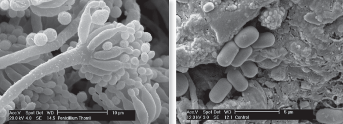 Fig. 8.1: In some instances morphological differences exist between species as shown above with fungal spore bearing structures on the left, but in many cases different bacterial species can look identical morphologically as shown on the right
