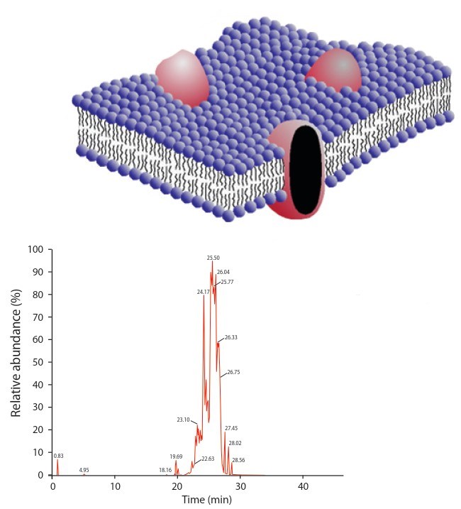 Fig. 8.3 : The membranes of all living cells are made up of 2 layers of phospholipids known as the lipid bi-layer (blue) as well as proteins (red) (above). The phospholipids vary in their molecular structure, such as the number of carbon atoms that they contain. Different microorganisms contain different proportions of these lipids in their cellular membranes and these can be extracted and quantified through a technique called gas chromatography (left). This allows quantification of the proportions of each phospholipids within a soil sample, which together produces a ‘fingerprint’ of the microbial community. Through comparisons of different community fingerprints the effects of different variables or changes in community structure over space or time can be investigated and quantified