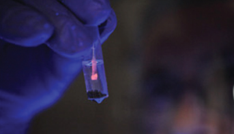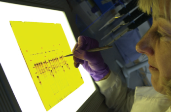 Fig. 8.6: Fragments of DNA from different species can be separated by electrophoresis on a gel seen here being visualised under UV light to show the DNA fluorescencing
