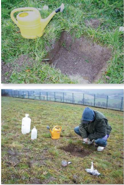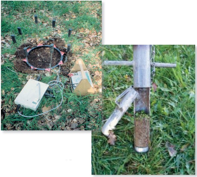 Fig. 8.8: Different techniques for extracting soil fauna from the soil. The techniques shown are: Formalin extraction and hand sorting of earthworms (photos to the left); electrical method for earthworm sampling (above middle), and a soil corer for extracting mesofauna groups (right)