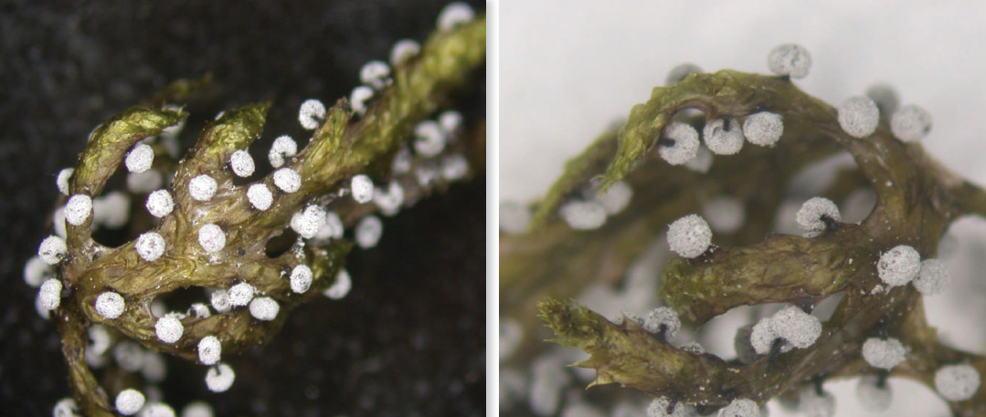 Fig. IV.III: The above two images show the fruiting bodies of myxomycetes which have formed on a moss