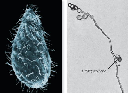 Fig. V.I: As well as the vampyrellids, other protozoa also eat fungi. The Grossglockneria acuta (above left) is about 70 μm in size and belongs to a ciliate group unique to soil known as Grossglocknerids. It has a special mouth located near the apical end and (above right) can be seen feeding on a fungal hyphae