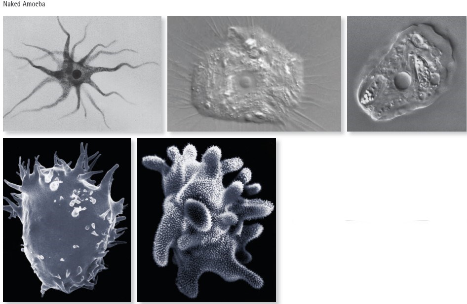 Fig. V.III: These images show various species of naked amoebae. The three above images were taken via light microscopy, with the two images to the left being taken via scanning electron microscopy, with colour added post production.