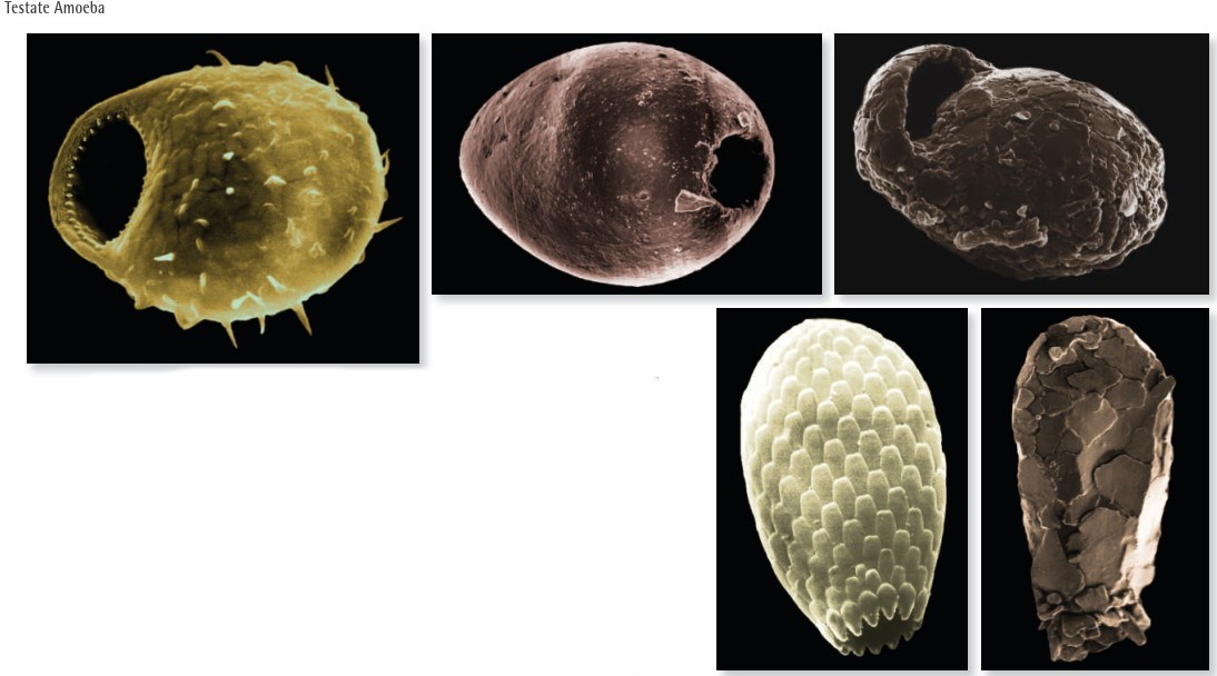 Fig. V.IV: These images show scanning electron micrographs (with post production colour added) of various testate amoebae. Their size ranges between 30 μm and 100 μm. There are usually up to 20,000 individual testate amoeba in just 1 g of soil. Testate amoebae play an important role in the energy flux of the soil and are excellent indicators of soil quality. The testate amoebae are basically similar to the naked amoebae, except of having a shell with a small opening called pseudostome. The shell is either made of siliceous platelets produced by the amoeba, as in Corythion asperulum (top left) and Euglypha (bottom left), or of mineralic particles taken from the soil environment, as in Pseudawerintzewia orbistoma (top middle), Difflugia lucida (bottom right), and Centropxsis cryptostoma (top right). The pseudostome of soil testate amoebae is often smaller than that of lake and river dwelling species to minimise loss of water. Accordingly, many of the species occurring in soil are specialised and restricted to the soil environment