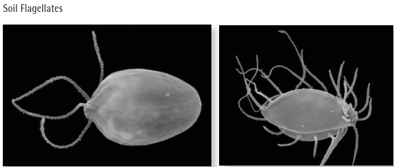 Fig. V.V: The images to the left show electron micrographs (with post production colour added) of two different species of soil flagellates, named for the long tentacle like protrusions called flagella which are used for locomotion. Polytomella sp. (left) has four flagella and is very common in soil globally. They are usually about 20 μm in size. Hemimastix amphikineta, a 20 μm-sized flagellate with two rows of flagella, occurs only in soils in central and south America as well as Australia soils, likely being a palaeoendemic, that is it probably used to exist over a much greater range which has become reduced in size over time. The fine structure of this organism is so peculiar that it has been classified in a distinct phylum, the “Hemimastigophora”