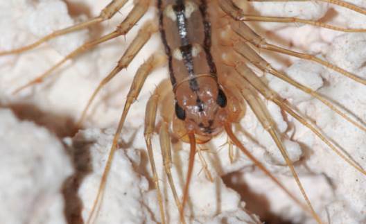 Fig. XIV.V: A centipede of the species Scutigera coleoptrata, one of several species of chilopoda commonly known as house centipedes. They feed on spiders, termites, cockroaches and ants, and other small insects