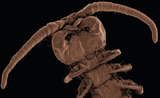 Fig. XIV.VI: A scanning electron micrograph showing the underside of a centipedes head and first four body segments. Clearly visible are the forcipules, a feature unique to centipedes. These are modified front legs which form a pincer like appendage just behind the head. These are used for capturing prey and are capable of injecting venom