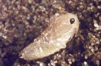 Fig. XVIII.III: The pupal stage lasts two or three weeks and is protected in a subterranean hole that the larva digs out before metamorphosis. Despite its harmless look, the pupa is strongly protected against predators and fungal attacks by manifold chemical substances, including ketones, aldehydes, alcohols, esters and carboxylic acids secreted by lateral exocrine glands