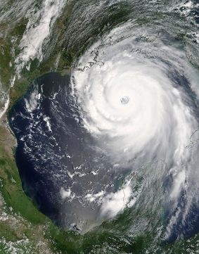 A satellite view of Hurricane Katrina, August 28, 2005. One of the most powerful storms to ever strike the United States, Katrina was a Category 5 hurricane that sustained winds of 160 miles per hour with even stronger gusts. The number of Category 4 and 5 hurricanes has almost doubled in the last thirty years, a fact that some climate experts attribute to global warming, specifically the rise in ocean surface temperature (Jeff Schmaltz, MODIS Rapid Response Team, NASA/GSFC).