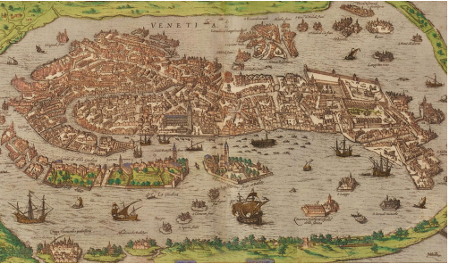 A 1493 view of Venice from the Nuremberg Chronicle, an illustrated history of the earth from creation through the fifteenth century. The Republic of Venice’s favorable location astride trade routes linking Europe to the Red Sea and beyond helped Venice to become one of the most prosperous cities in Europe in the fifteenth century (Jay I. Kislak Collection, Rare Book and Special Collections Division, Library of Congress).