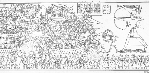 Illustration of battle with the Sea People, Medinet Habu, Egypt, c. 1832-44. This famous scene from the north wall of the Mortuary Temple of Ramesses III at Medinet Habu is often used to illustrate the Egyptian campaign against the Sea Peoples in what has come to be known as the Battle of the Delta (New York Public Library).