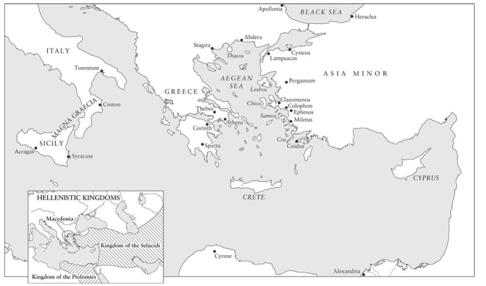 Map 4.1. The world of ancient Greece. Greek civilization originated as a cluster of small city-states around the Aegean Sea. Greek science first arose in towns along the Ionian coast of Asia Minor. After the conquests of Alexander the Great in the fourth century все the Greek world stretched from Egypt to the borders of China, forming the largest empire in the ancient world. After Alexander’s death in 323, his empire (inset) collapsed into three states: Macedonian Greece, Ptolemaic Egypt, and the Seleucid Kingdom in Mesopotamia.