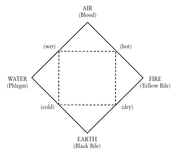 Fig. 4.5. The Aristotelian elements. In Aristotle’s matter theory, pairs of qualities (hot-cold, wet-dry) define each of the four elements: earth, air, fire, and water. Substitute one quality for another, and the element changes. Each of the four elements also came to have an associated “humour,” which connected Aristotle’s views on matter with physiology and medical theory.