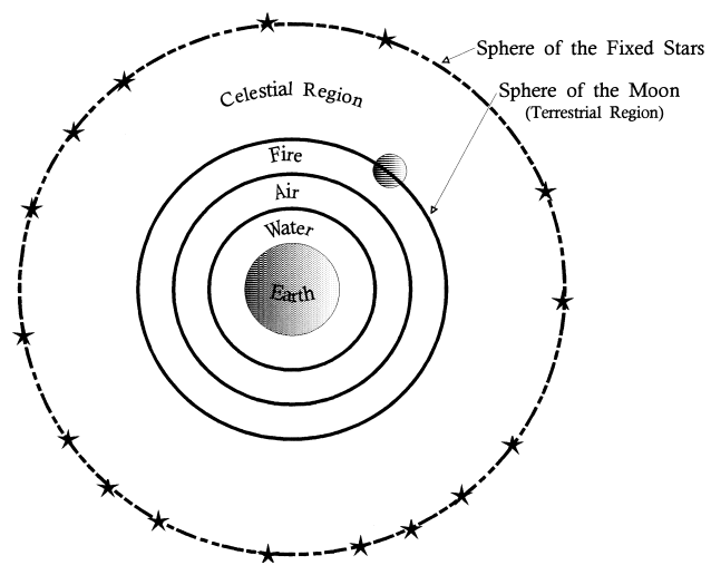 Fig. 4.6. The Aristotelian cosmos. According to Aristotle, each of the four elements has a “natural place” in the universe. In the terrestrial region (to the height of the moon), earth and water move “naturally” in straight lines downward toward the center of the cosmos (Earth), while air and fire “naturally” move in straight lines upward and away from the center. The sphere of the moon separates the terrestrial region, with its four elements (including fiery meteors and comets), from the celestial region—the realm of the fifth, “aetherial” element whose natural motion is circular. The stars and planets reside in the celestial region and take their circular motions from the aetherial spheres in which they are embedded.