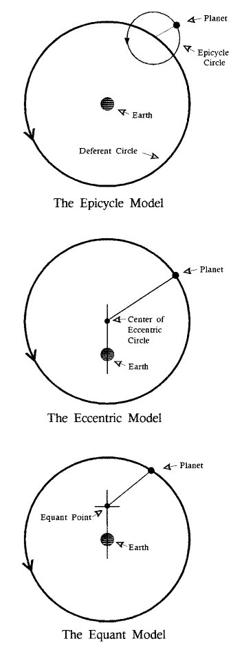 Fig. 5.1. Ptolemy’s astronomical devices. To reconcile observed planetary positions with the doctrine of uniform circular motion Ptolemy employed epicycles, eccentric circles, and equant points. The epicycle model involves placing circles on circles; eccentrics are off-centered circles; the equant point is an imaginary point in space from which uniform circular motion is measured.