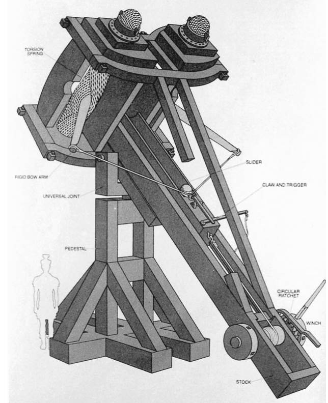 Fig. 5.3. The torsion-spring catapult. The Greeks under Philip of Macedon had begun to use ballistic artillery in the form of machines that could hurl large projectiles at an enemy. In some designs the action was produced by twisting and suddenly releasing bundles of elastic material. This large Roman model fired stones weighing 70 pounds. Hellenistic scientist-engineers experimented to improve the devices.