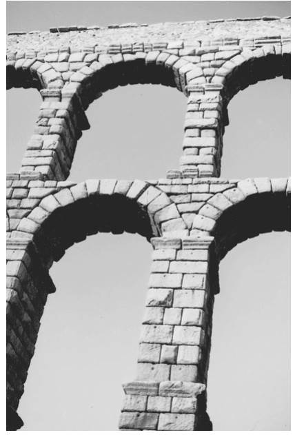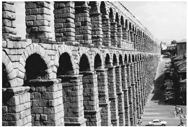 Fig. 5.4. Roman building technology. Roman engineers were highly competent in the use of the wedge arch in the construction of buildings, bridges, and elevated aqueducts. This Roman aqueduct in Segovia, Spain, is an outstanding example. The invention of cement greatly facilitated Roman building techniques.