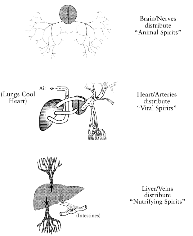 Fig. 5.5. Galenic physiology. Ancient physicians and students of anatomy separated the internal organs into three distinct subsystems governed by three different “spirits” functioning in the human body: a psychic essence permeating the brain and the nerves, a vivifying arterial spirit arising in the heart, and a nutrifying venous spirit originating in the liver.