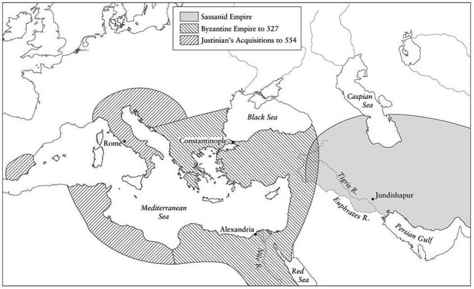 Map 6.1: Byzantium and Sassanid Persia. In late antiquity two derivative civilizations took root in the Middle East—the Byzantine Empire centered in Constantinople and Sassanid Persia in the heartland of ancient Mesopotamia. Both assimilated ancient Greek science and became centers of learning.