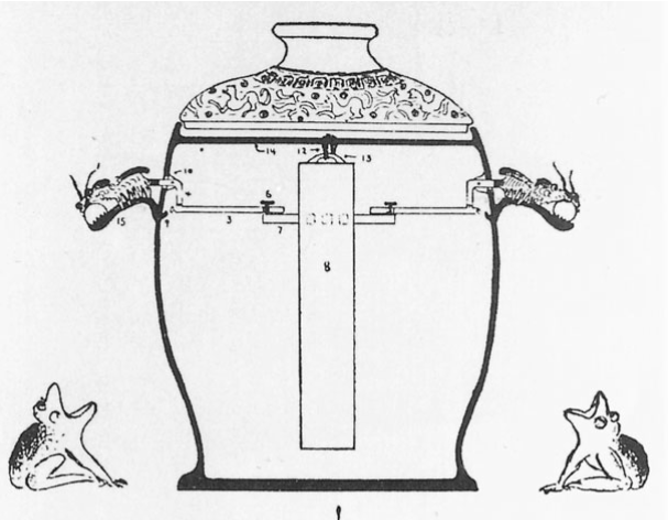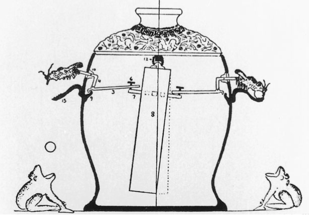 Fig. 7.6. Chinese seismograph. Earthquakes regularly affected China, and the centralized state was responsible for providing relief for earthquake damage. As early as the second century BCE, Chinese experts developed the device depicted here. An earthquake would jostle a suspended weight inside a large bronze jar, releasing one of a number of balls and indicating the direction of the quake.