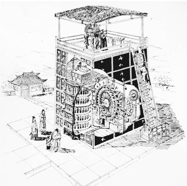 Fig. 7.5. Su Sung’s astronomical clock. Built in 1090 Su Sung’s clock was an impressive feat of mechanical engineering and the most complex piece of clockwork to that point in history. Housed within a 40-foot-high tower, powered by a waterwheel, and controlled by complicated gearing, Su Sung’s machine counted out the hours and turned a bronze armillary sphere and a celestial globe in synchrony with the heavens.