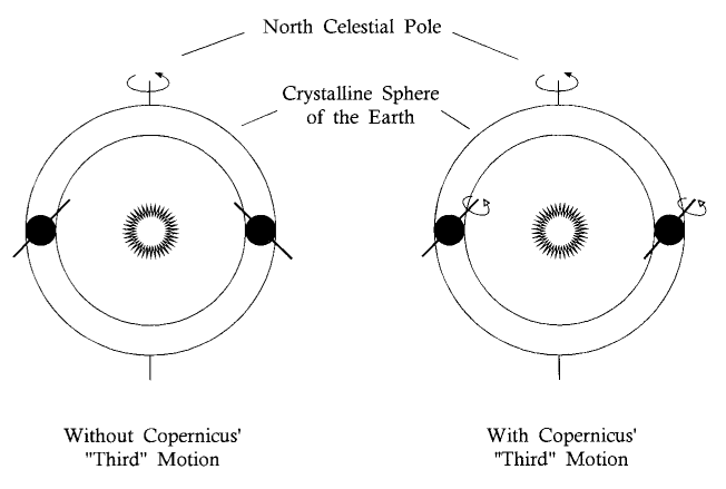 The Third Motion and Crystalline Spheres. Copernicus's third motion reveals his deep connection to traditional astronomy, as he retained the concept of planetary bodies embedded in solid, transparent crystalline spheres. He believed these spheres physically carried the planets, meaning Earth was transported within its own sphere. To maintain Earth's axial tilt constant at approximately 23.5 degrees—essential for seasons—as its sphere revolved, he introduced an additional conical wobble of the axis. This complex motion ensured the north celestial pole pointed steadily toward Polaris throughout the year. By slightly adjusting this motion's period, he also accounted for the slow precession of the equinoxes.
