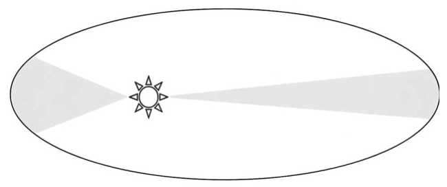 Fig. 11.7. Kepler’s elliptical motion of the planets. Based on Tycho Brahe’s data, Johannes Kepler broke with the ancient doctrine of uniform circular motion. He formulated three fundamental laws: 1) Elliptical orbits with the Sun at one focus; 2) The law of equal areas; and 3) The harmonic law, where the square of a planet's orbital period is proportional to the cube of its semi-major axis (t² ∝ r³). Kepler derived these laws from observation and geometry, lacking a complete physical explanation for the motions he described.