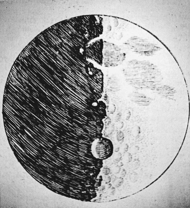 Fig. 12.1. Galileo’s Starry Messenger. In his famous pamphlet published in 1610, Galileo depicted the results of the observations he made with the telescope. He showed, contrary to accepted dogma, that the moon was not perfectly smooth and had mountains.