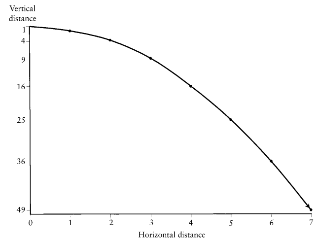 Figure 12.4. Parabolic motion of projectiles. Galileo decomposed projectile motion into two components: uniform acceleration downward and uniform horizontal motion. Their combination produces a parabolic path, recasting this ancient problem into its modern form.