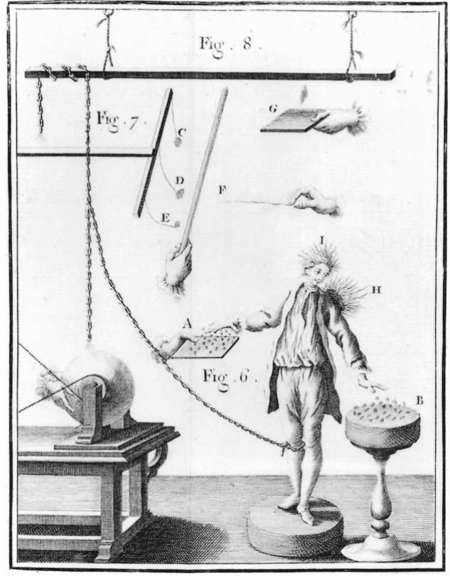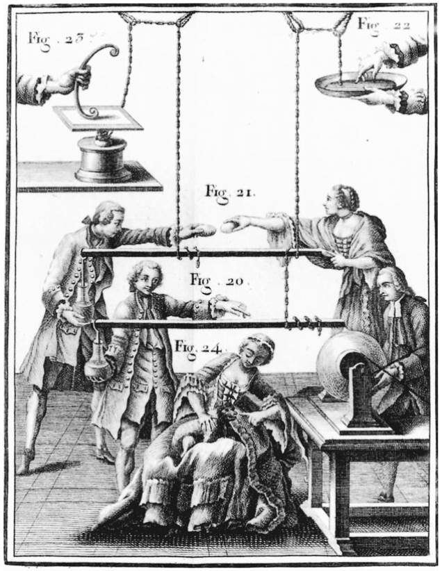 Fig. 15.1. Electrical equipment. The scientific investigation of static electricity blossomed in the eighteenth century aided in essential ways by the development of new experimental apparatus, such as glass or sulfur ball generators, shown here. These engravings are taken from the Abbe Nollet’s Lessons on Experimental Physics (1765). They illustrate something of the parlor-game character that often accompanied demonstrations concerning static electricity in the eighteenth century.