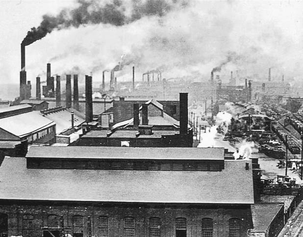 Fig. 15.3. Industrial pollution. In developed societies today, scenes such as this one from the 1920s are less common due to increased emissions controls and environmental concerns. However, such regulations remain a significant challenge in developing regions where the costs are harder to meet. A central question for the future is whether industrial civilization can achieve a sustainable balance with the planet's ecology.