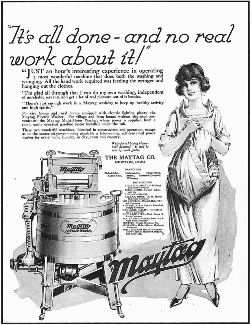 Fig. 17.3. More work for Mother? A 1919 advertisement for the Maytag Electric Washer and Wringer touting “an hour’s interesting experience . . . independent of unreliable servants.” New appliances eased the burden of housework for women, yet arguably enslaved them with more chores and higher standards for the modern home.