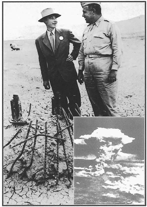 Fig. 19.1. The Atomic Age begins. J. Robert Oppenheimer and General Leslie R. Groves inspect the remains of the Trinity test site following the first explosion of a nuclear bomb (New Mexico, July 16, 1945). Inset: The “Little Boy” atomic bomb exploding over Hiroshima, Japan, on August 6, 1945.