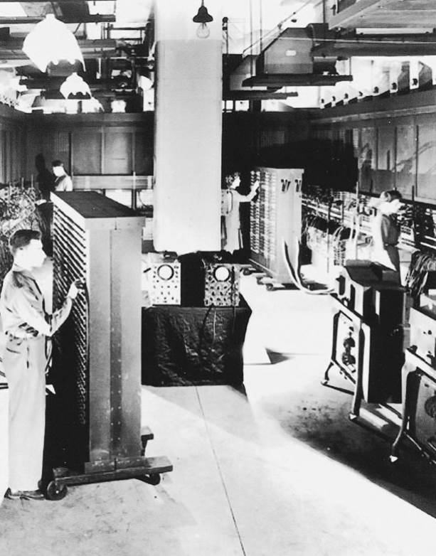 Fig. 19.3. Early computers. An electronic calculating behemoth with 18,000 vacuum tubes, the ENIAC machine (1946) filled a large room and consumed huge amounts of power.