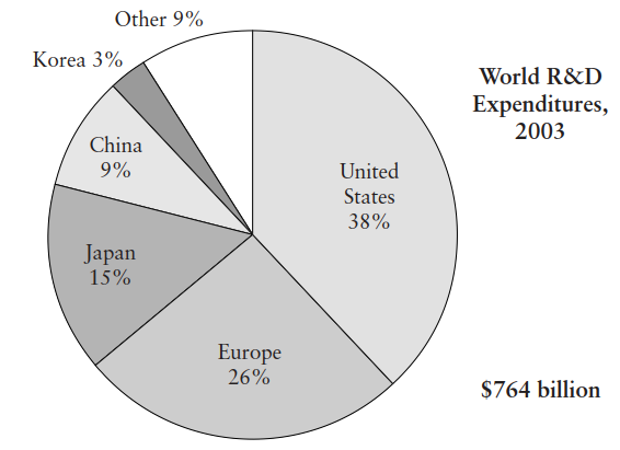 Figure 20.1. World spending on science and technology. Led by the United States, industrialized countries now spend almost three quarters of a trillion dollars on research on science and technology. The overall percentage of U.S. R&D expenditures has been declining steadily, and relative to its economy, the United States now ranks fifth in the world. Other countries devote proportionally more to non- applied research.