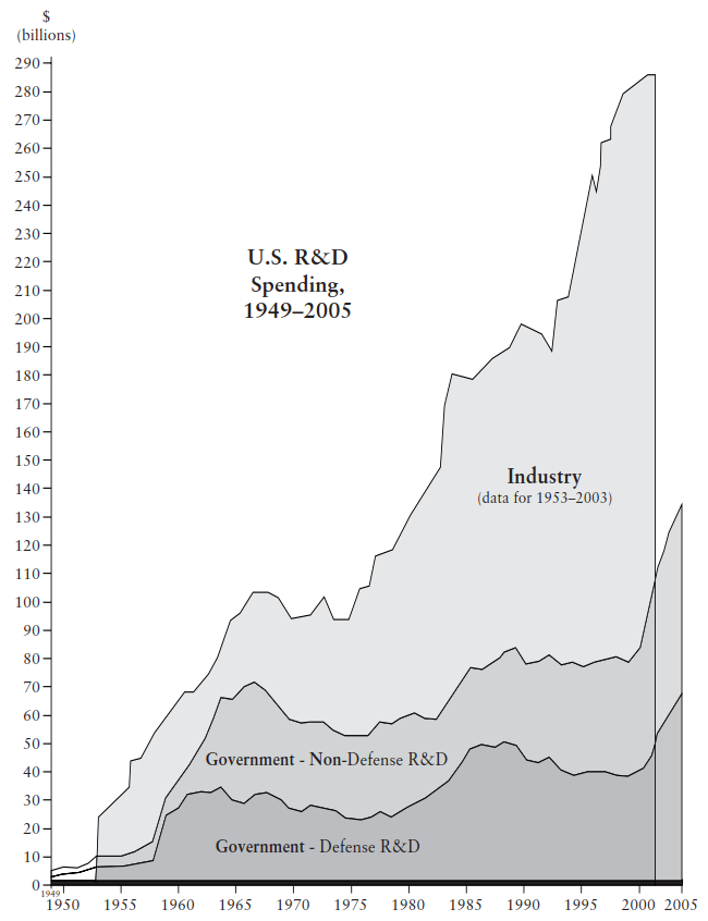 Historical analysis reveals an explosive growth in R&D funding, particularly following World War II. U.S. government science funding, for instance, grew from $160 million in 1930 to $1.52 billion by 1945. The Cold War, especially after the 1957 launch of Sputnik, triggered a sustained surge in both public and private investment. As shown in Figure 20.2, inflation-adjusted U.S. R&D spending nearly tripled since 1965, marking a historic prioritization of scientific research by government and industry.