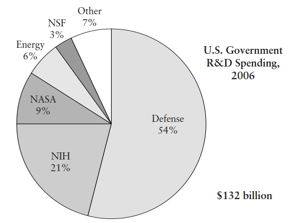 Figure 20.3. Funding priorities. More than half of U.S. government spending on research on science and technology is allocated to defense. Almost all of defense-related spending supports applied science and technology. Only a small fraction of federal funds goes to non- applied research, notably in the National Science Foundation (NSF).