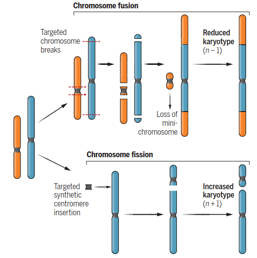 Manipulating chromosome number. Chromosome fusion can be achieved through precise end-joining of targeted breakpoints induced by CRISPR, producing a reduced karyotype (n – 1) when a minichromosome is lost. Chromosome fission increases chromosome number (n + 1) by introducing a synthetic centromere at a targeted site. These complementary approaches provide a framework for both basic and applied research.