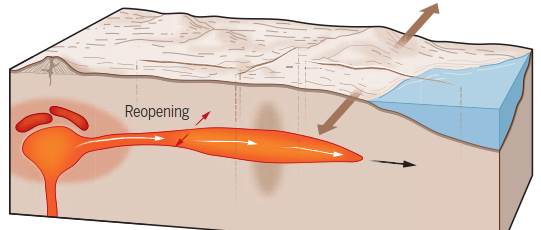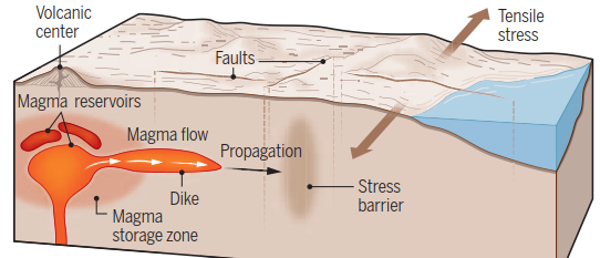 Lateral magma flow within Earth’s crust. Instead of a vertical eruption, magma can flow horizontally into a dike from a deep reservoir that is located underneath a volcanic center. The diking process creates a pumping system in which alternating cycles of contraction and expansion of the dike promote magma to travel laterally underneath Earth’s surface. This creates a potential hazard for unexpected eruption and associated seismicity.