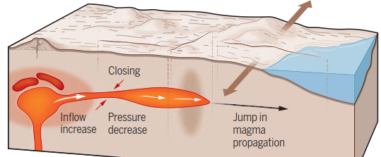 Sudden acceleration. Pressure from magma breaks the stress barrier, which triggers a jump in the propagation front, the closure of the dike at the back, and an increase in magma inflow.
