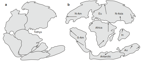 Fig. 17.2 Stages in development of present distribution of continents. a Joined landmass of Pangaea in Triassic. b Distribution of continents at end of Cretaceous. (after Bick 1993)
