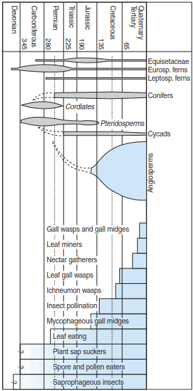 Zwolfer (1978) gave the first overview of geological occurrences of vascular plants as well as phytophageous and entomophageous insects, which addressed the development of communities. It was reported that both pollen and dead plant material were eaten by arthropods as early as the Devonian Period, and in the Permian leaves were consumed. In the Triassic, insect pollination of flowers occurred, and there were entomopha- geous parasites and plant galls. From the Tertiary onwards, all present-day phytophages are represented: miners, gall flies and gall gnats (Fig. 17.3).