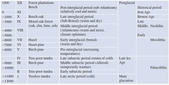 Table 17.2. Vegetation and climatic elements of late- and postglacial times. Columns for time, pollination zone I–XII (from Overbeck 1975), vegetation period, climate history and human prehistory (after Walter and Straka 1970)