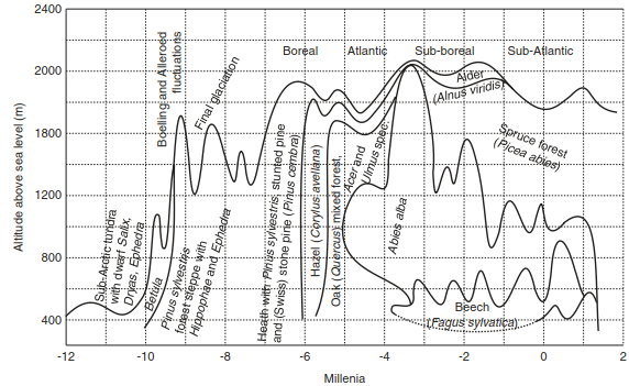 The history of vegetation during the Holocene in Europe has been documented by pollen analysis and radiocarbon dating (Table 17.2). Almost all plant species found using these techniques have survived to the present day. Today, comprehensive data sets are available that are directly or indirectly linked to the vegetation development in postglacial and Holocene times. Not all historical analysis is done with pollen and radiocarbon dating; other techniques include macrofossils, tree-line changes (Fig. 17.5) and tree rings.