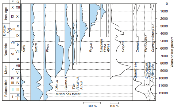 The warmest climatic conditions, and the corresponding development of vegetation, were experienced by the early Neolithic people in the Atlantic period about 6000-7000 BP. In Northern Europe, during this time of the “climatic optimum”, mean annual temperatures were 2-3 K higher than present temperatures. Mixed oak forests with deciduous trees requiring warm climatic and nutrient-rich edaphic conditions were dominant. In the montane areas, fir dominated in the western Alps, spruce in the eastern Alps and pines in the eastern part of Central Europe on nutrientpoor sites. Thermophilic species still occurred at dry sites with grassland vegetation.