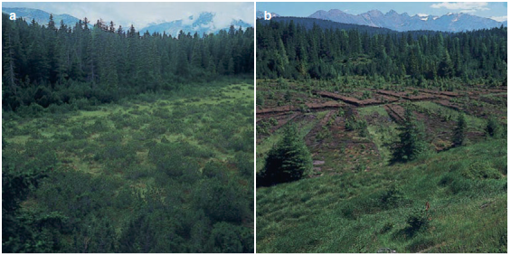 Fig. 17.7. Undisturbed and disturbed raised bogs. a Part of the almost natural “Pillermoor” (1600 m a.s.l.), which is a protected area in the lower Pitztal (Tyrol, Austria). b Part of same raised bog where peat was removed more than 30 years ago. Pollen analysis from this bog shows the postglacial development of vegetation of the montane region in Tyrol. (Photos: K. Müller-Hohenstein)
